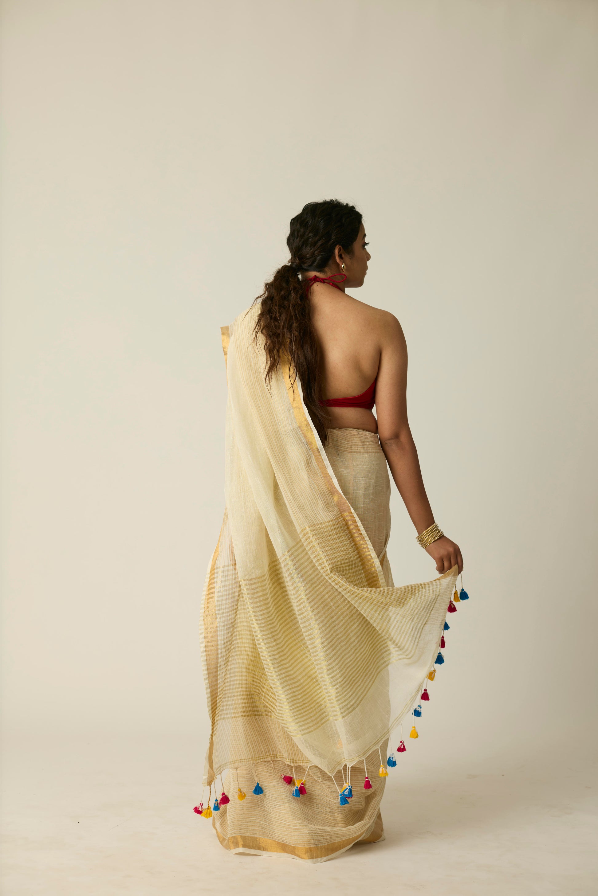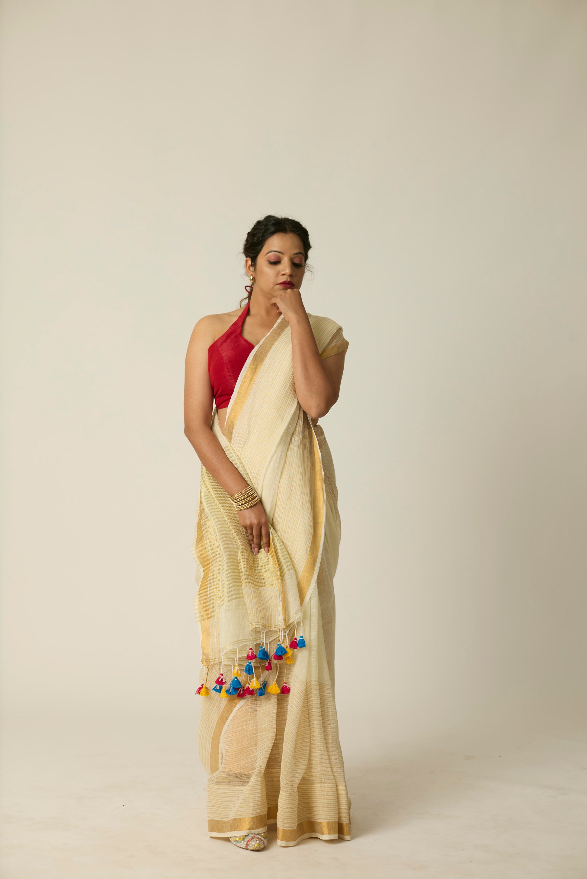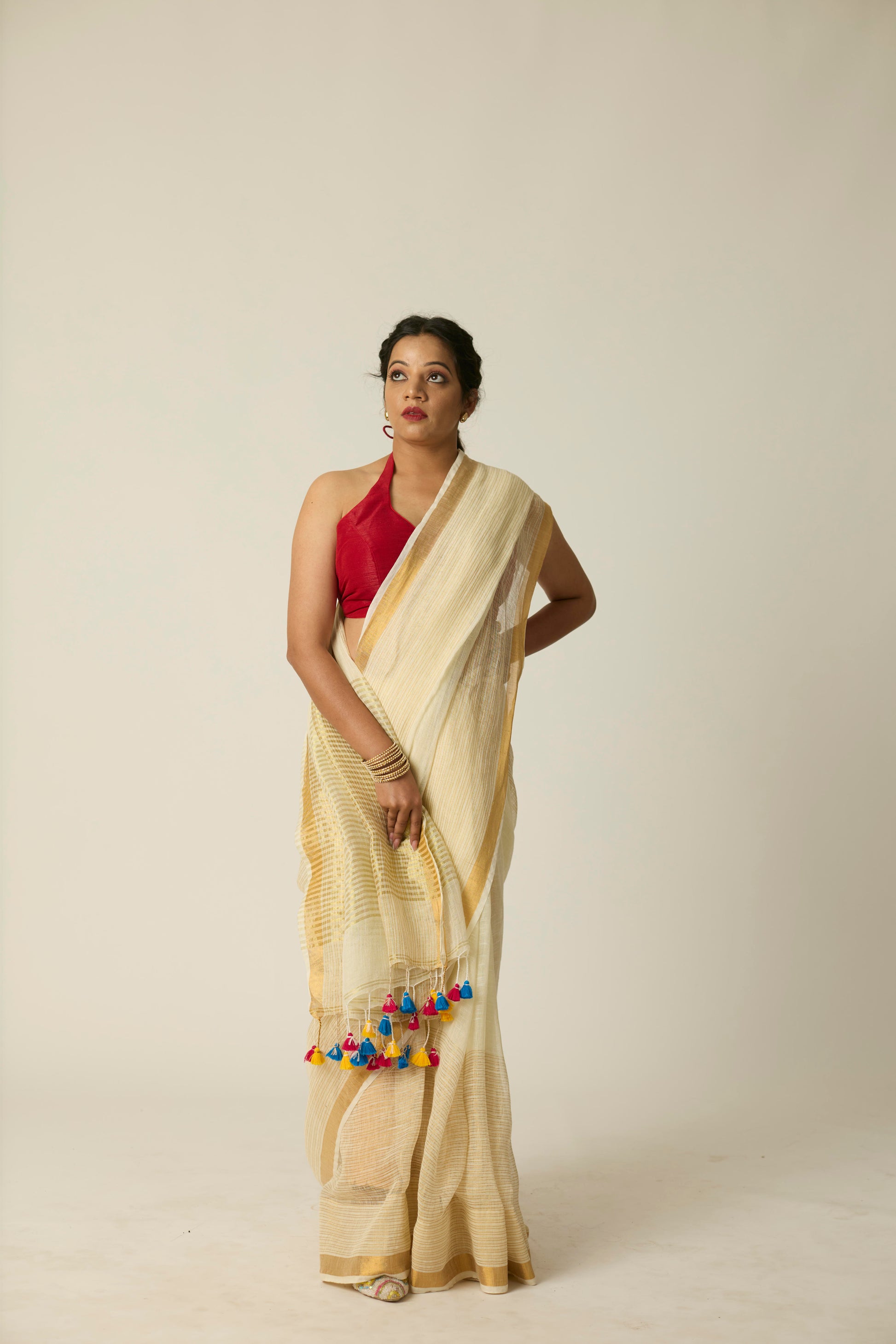 A wardrobe essential, the Ajreli saree features breathable linen weave for cool, airy texture ideal for warm climates. Built for both style and comfort, it's a refined choice for modern celebrations. Includes a matching blouse piece.