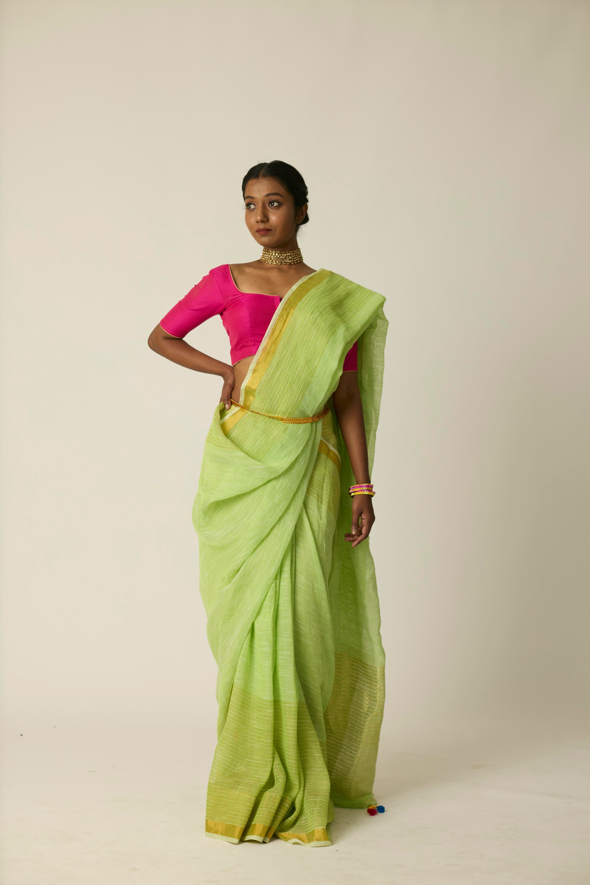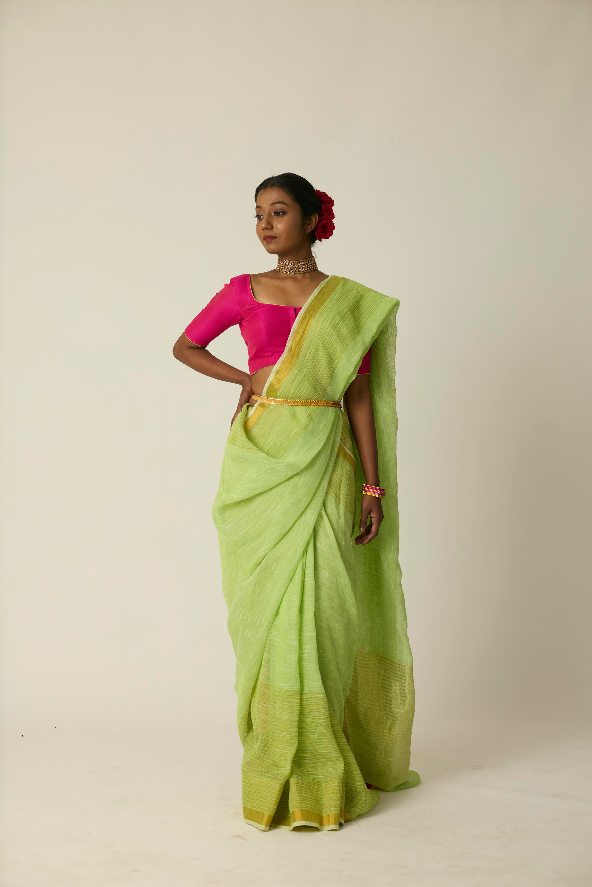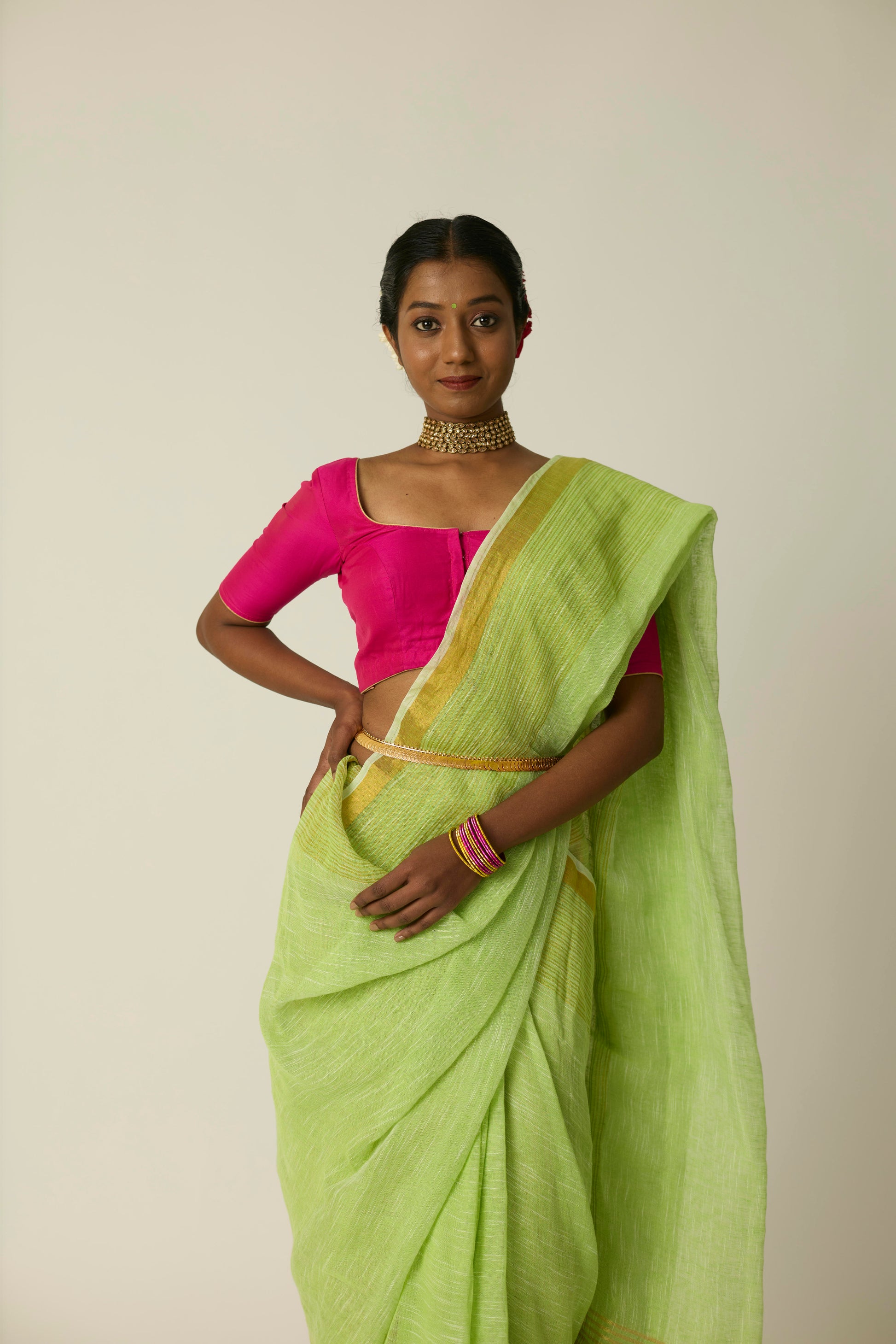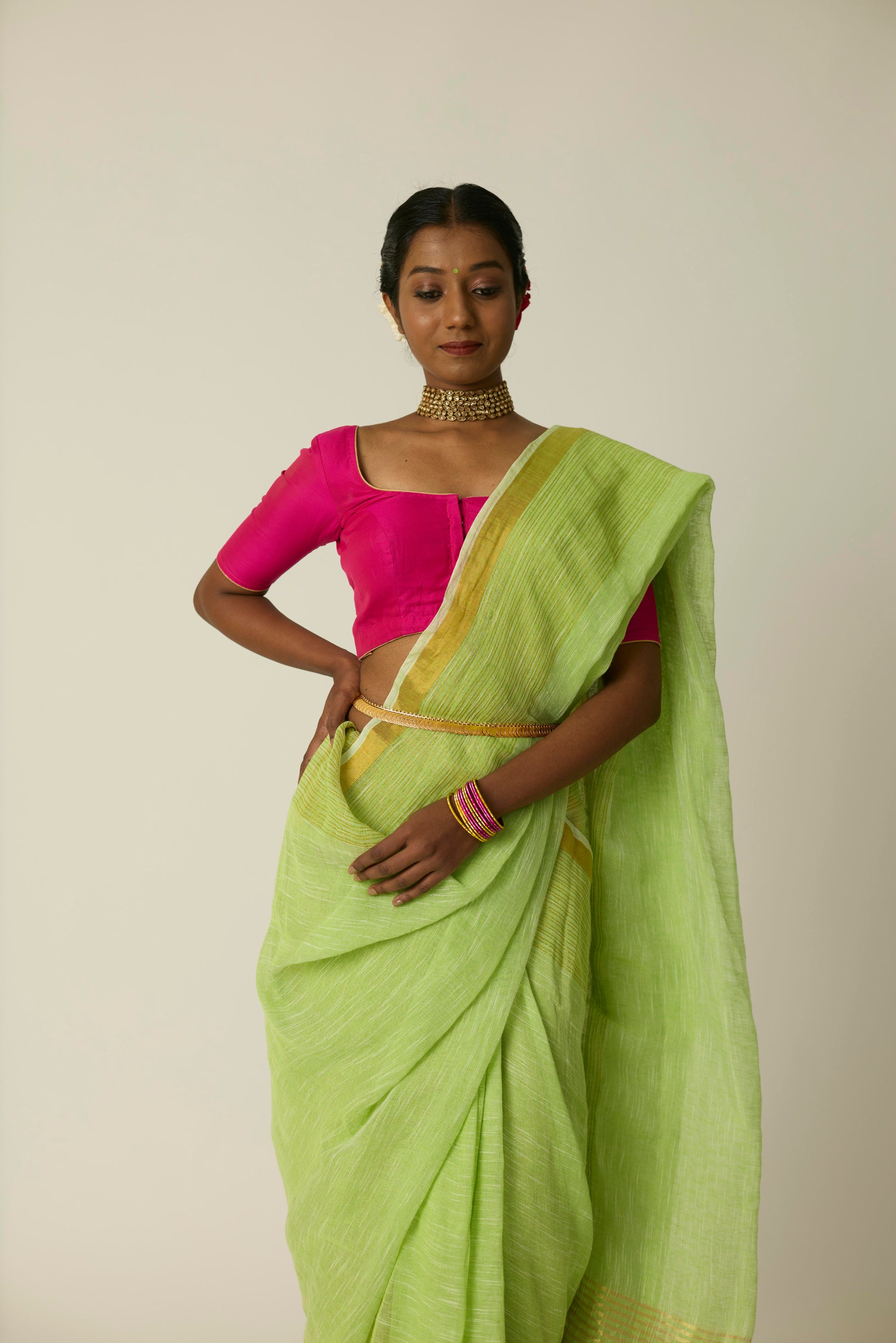 The Hari Sunheri saree is woven in breathable linen and bathed in a rich green hue. Its airy texture and natural drape deliver ease and sophistication in equal measure. Lightweight yet striking, this saree stands out effortlessly; whether it's a casual daytime gathering or an elegant evening event. Includes a matching blouse piece.