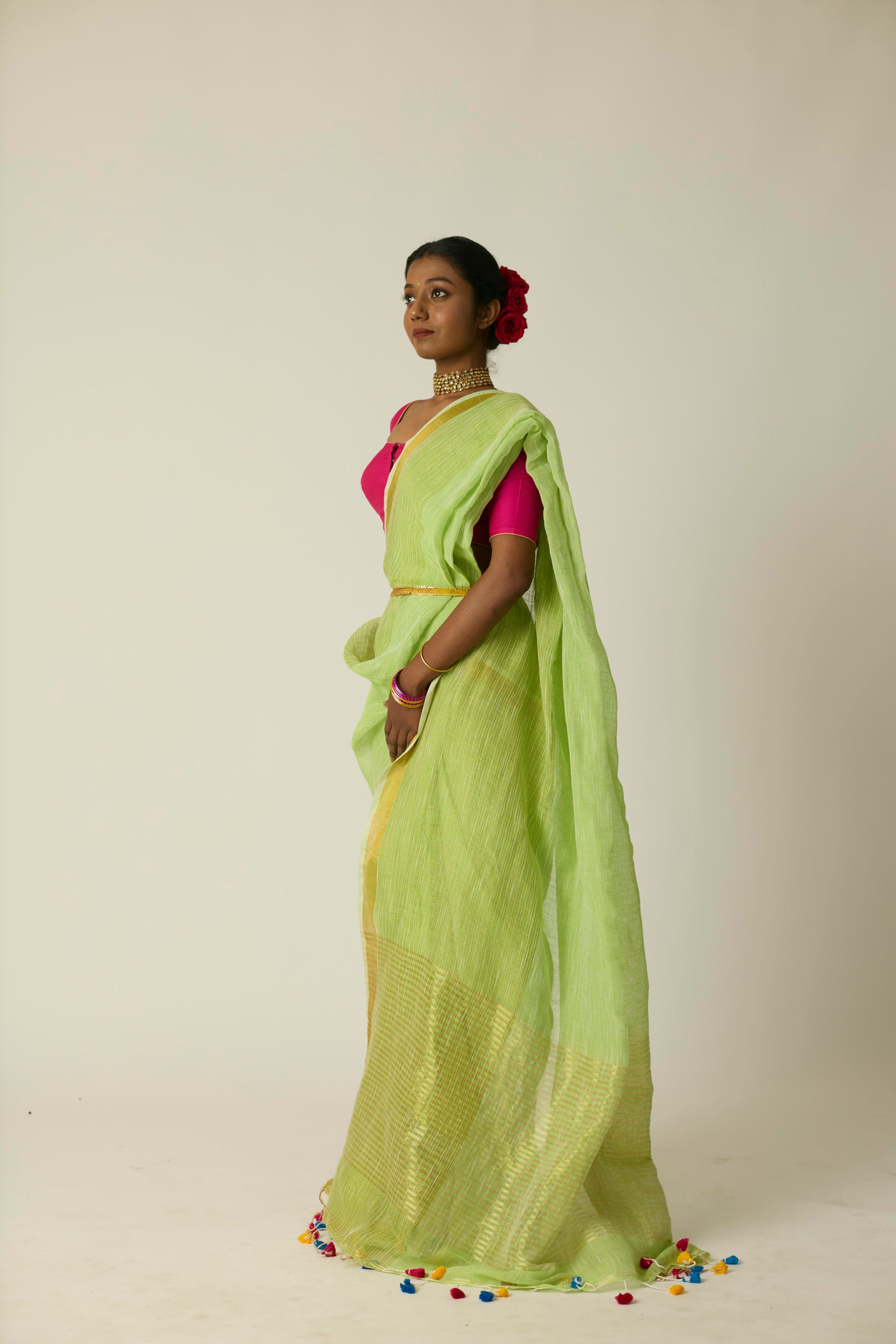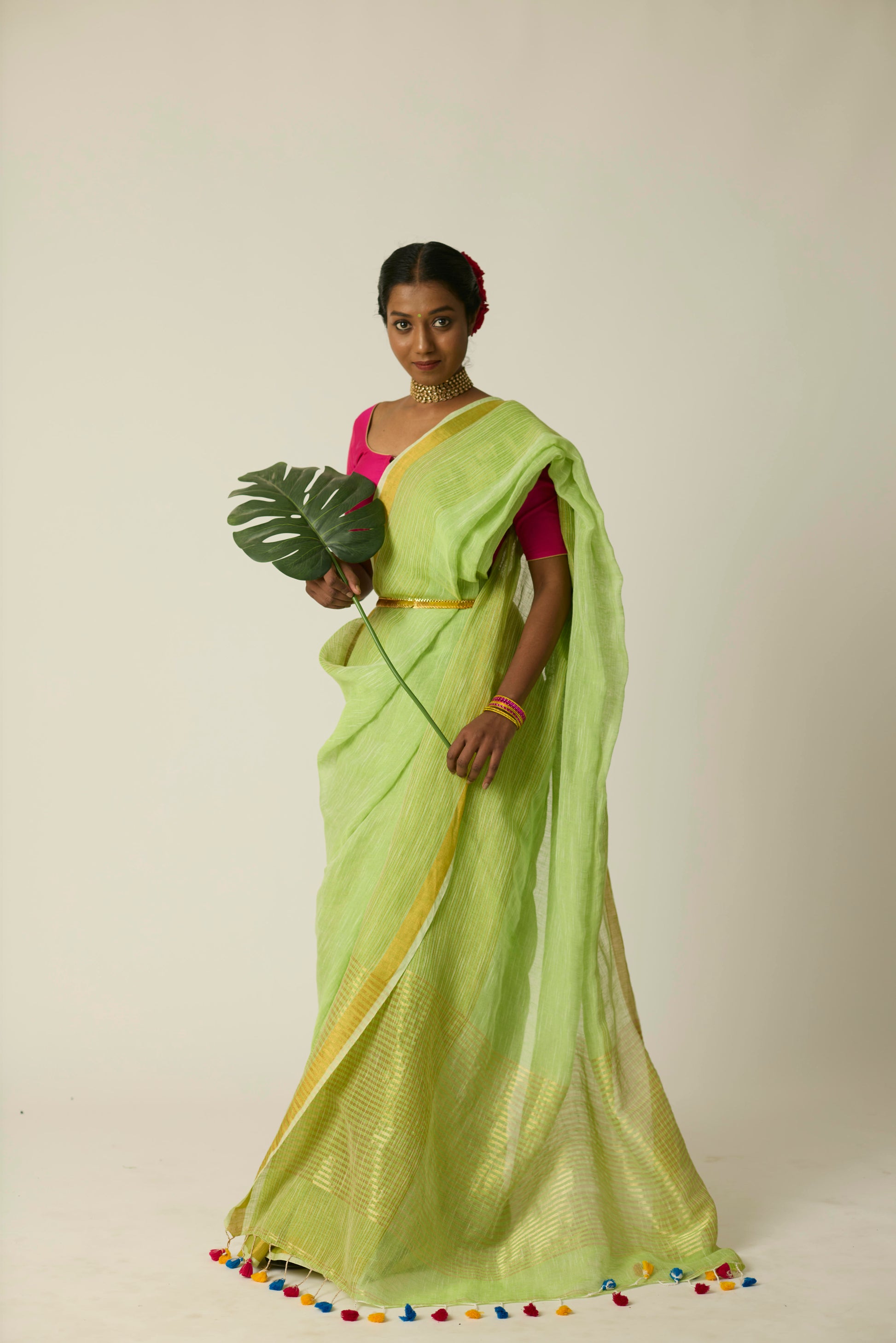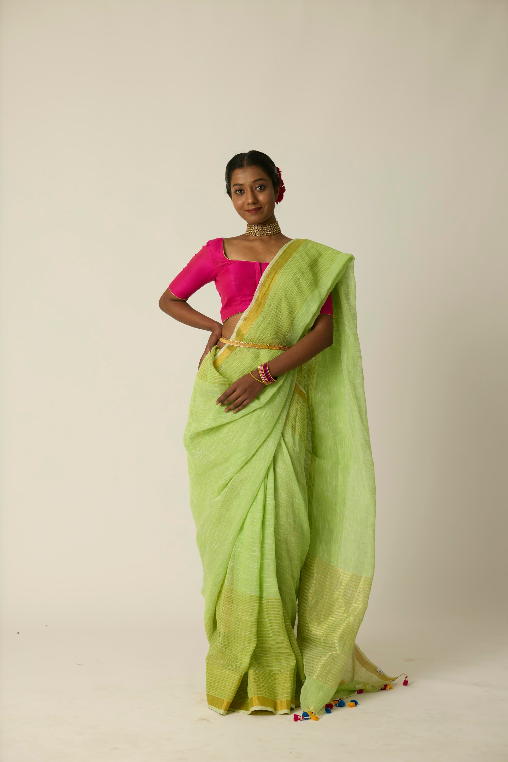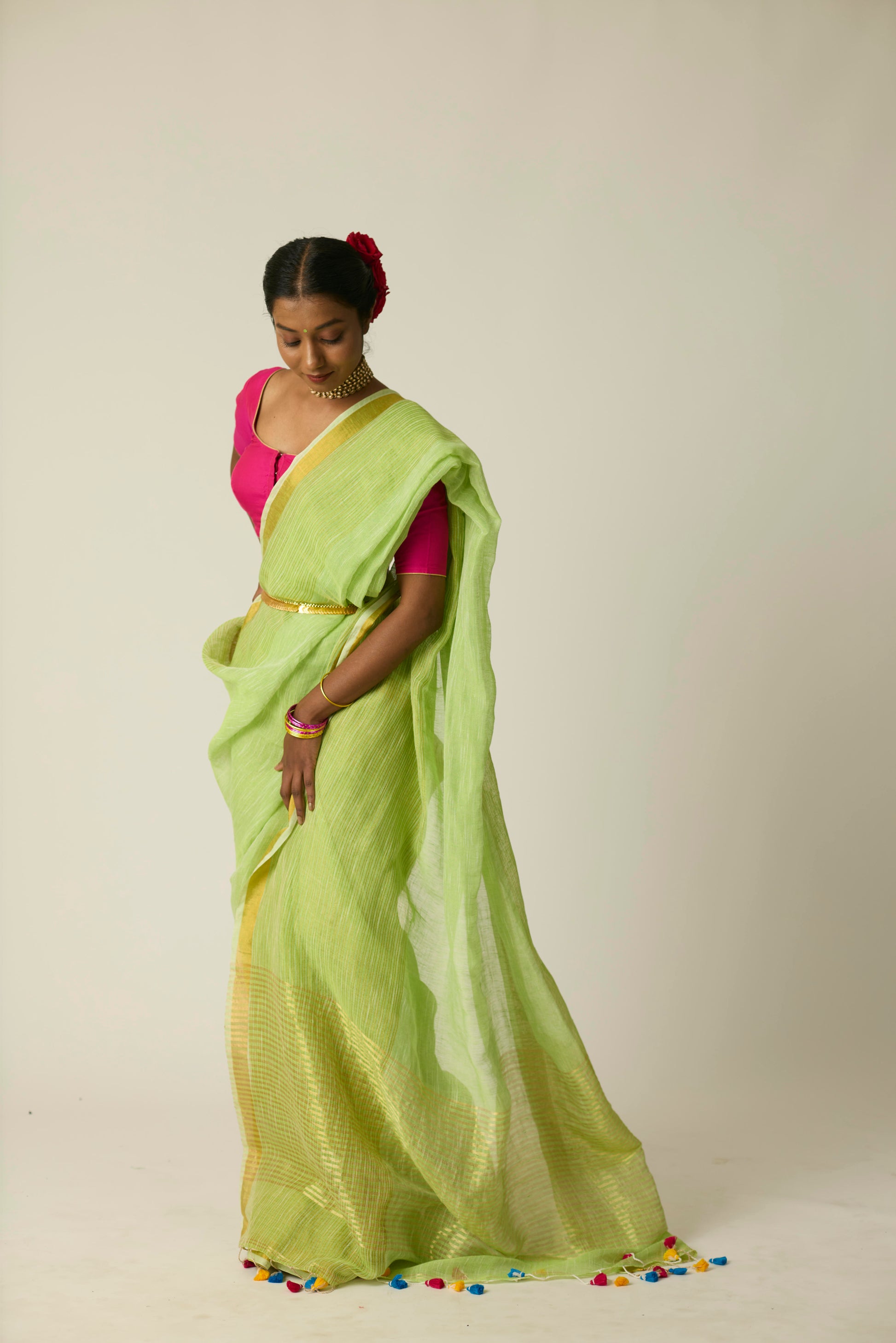 The Hari Sunheri saree is woven in breathable linen and bathed in a rich green hue. Its airy texture and natural drape deliver ease and sophistication in equal measure. Lightweight yet striking, this saree stands out effortlessly; whether it's a casual daytime gathering or an elegant evening event. Includes a matching blouse piece.