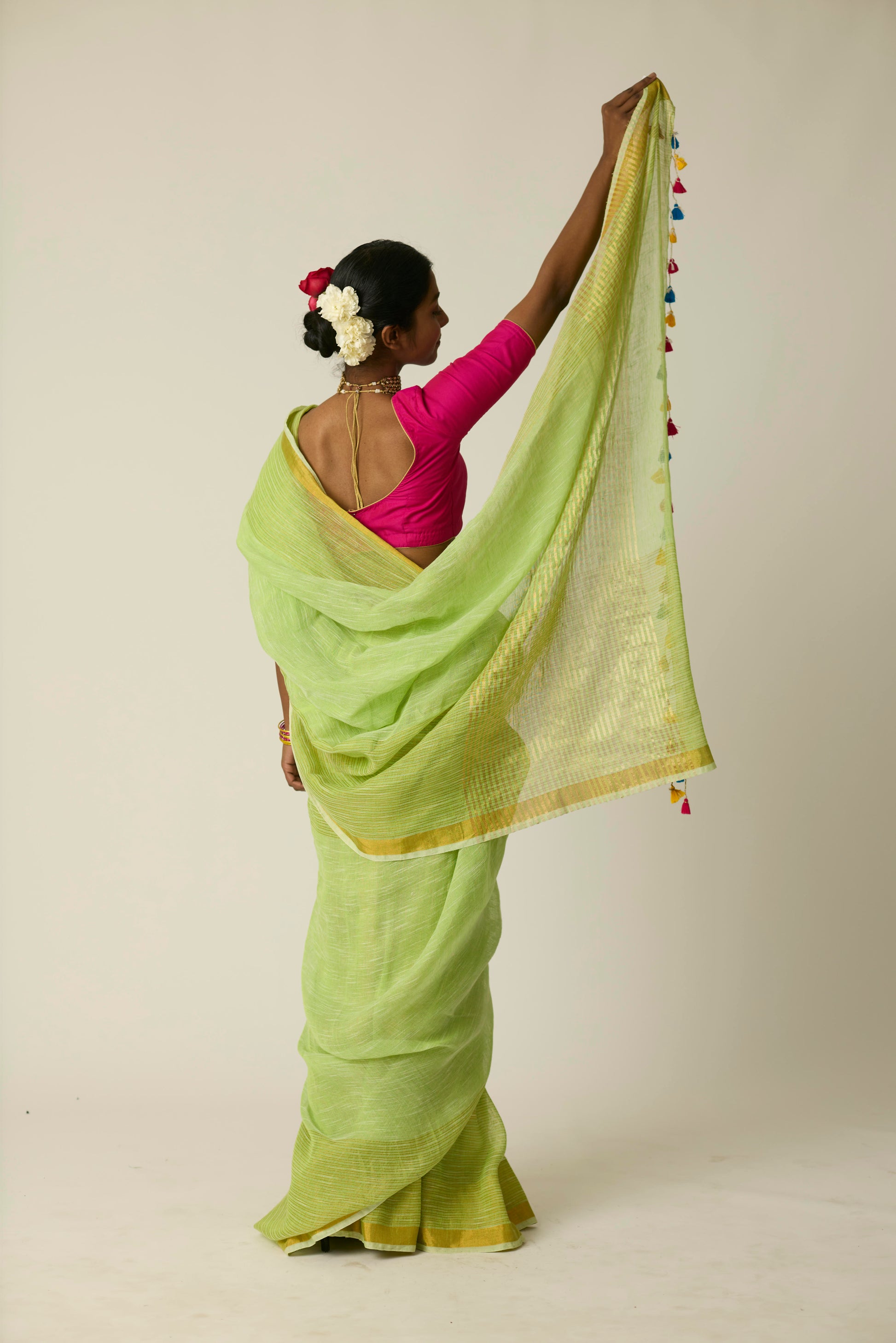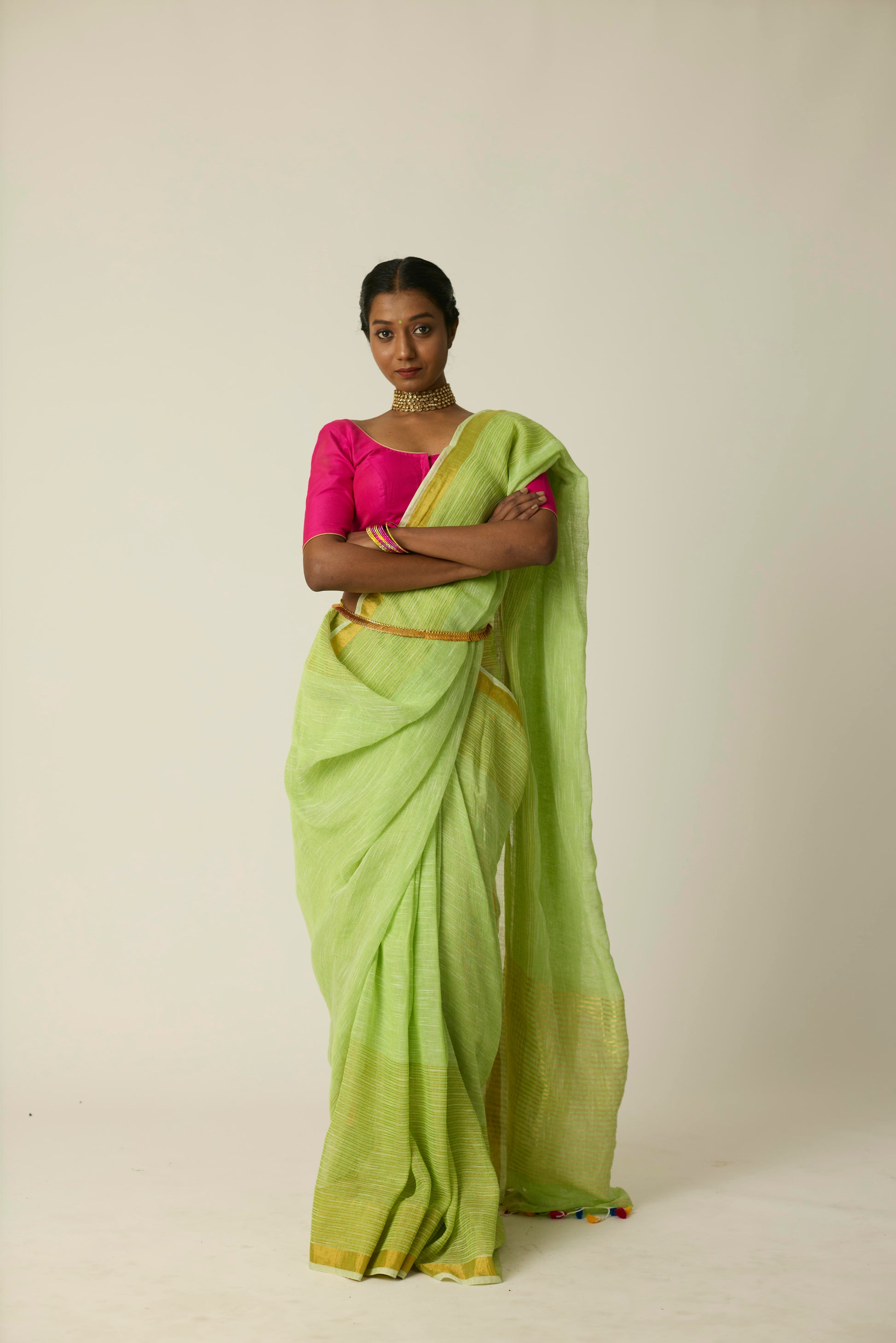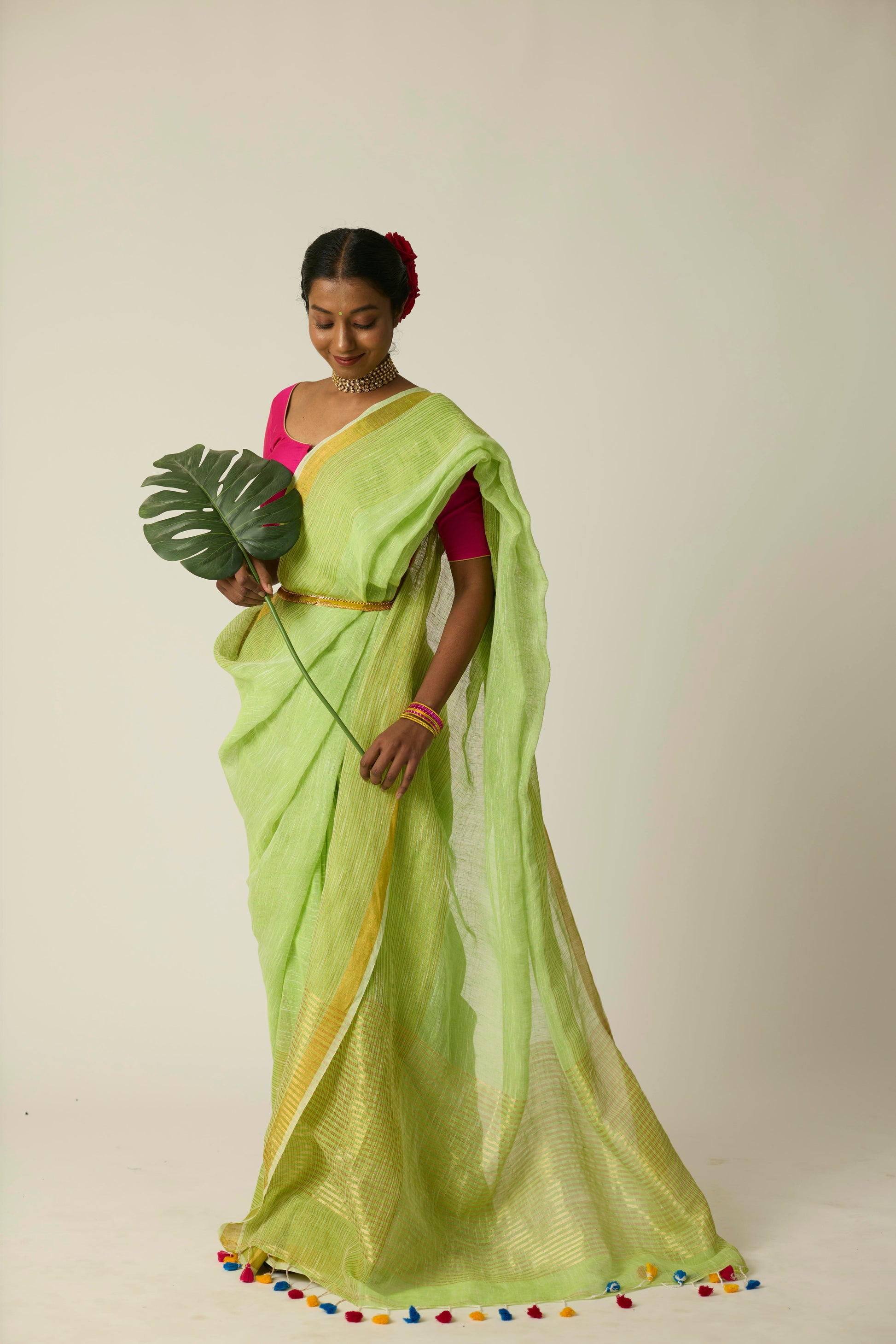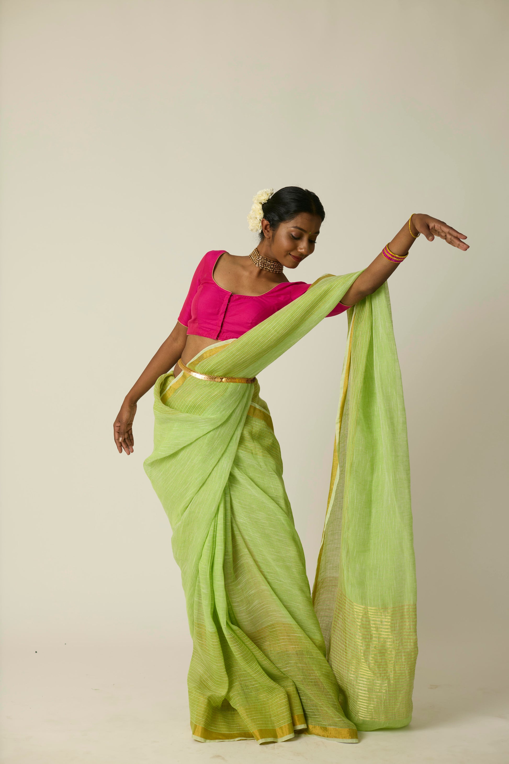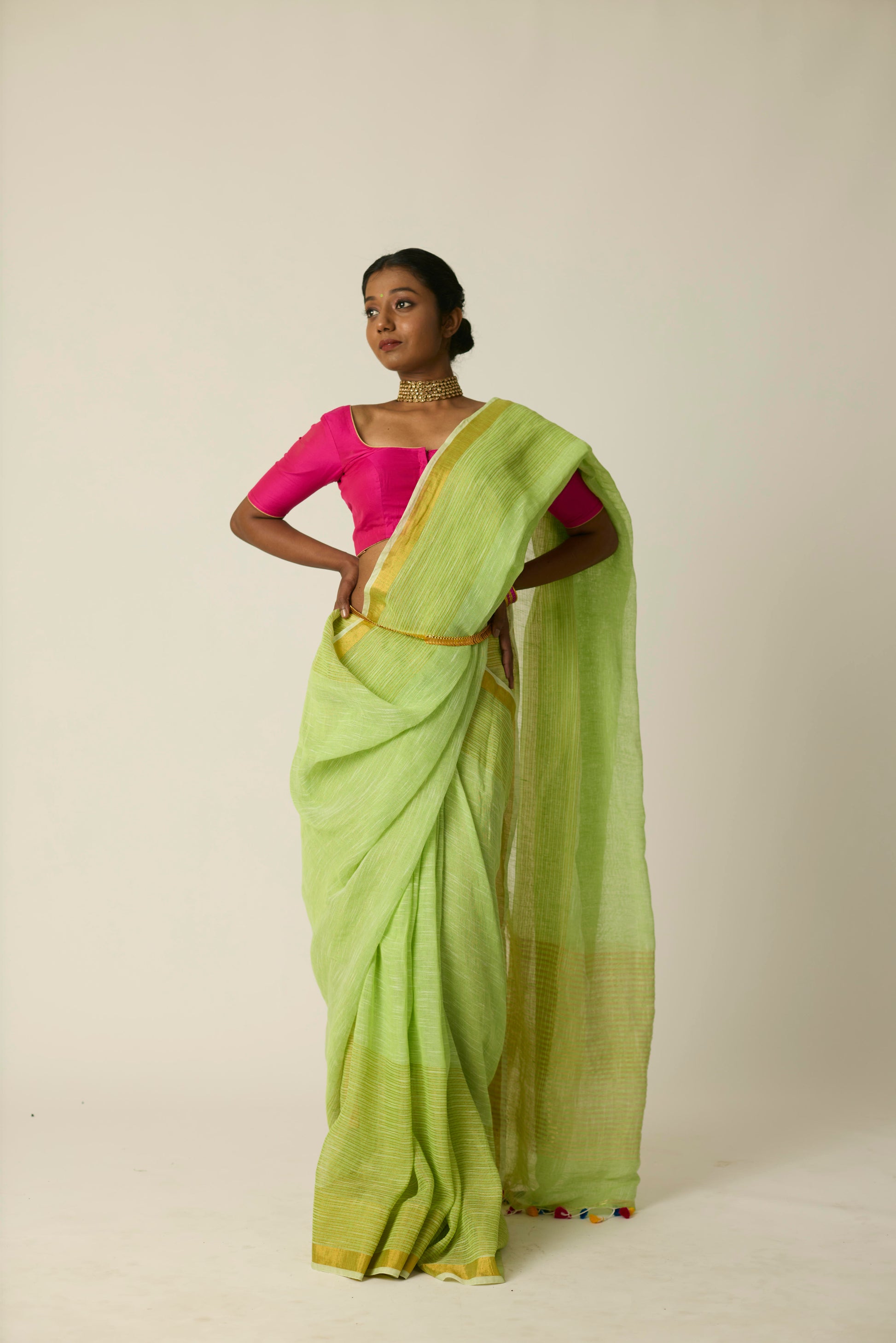 The Hari Sunheri saree is woven in breathable linen and bathed in a rich green hue. Its airy texture and natural drape deliver ease and sophistication in equal measure. Lightweight yet striking, this saree stands out effortlessly; whether it's a casual daytime gathering or an elegant evening event. Includes a matching blouse piece.