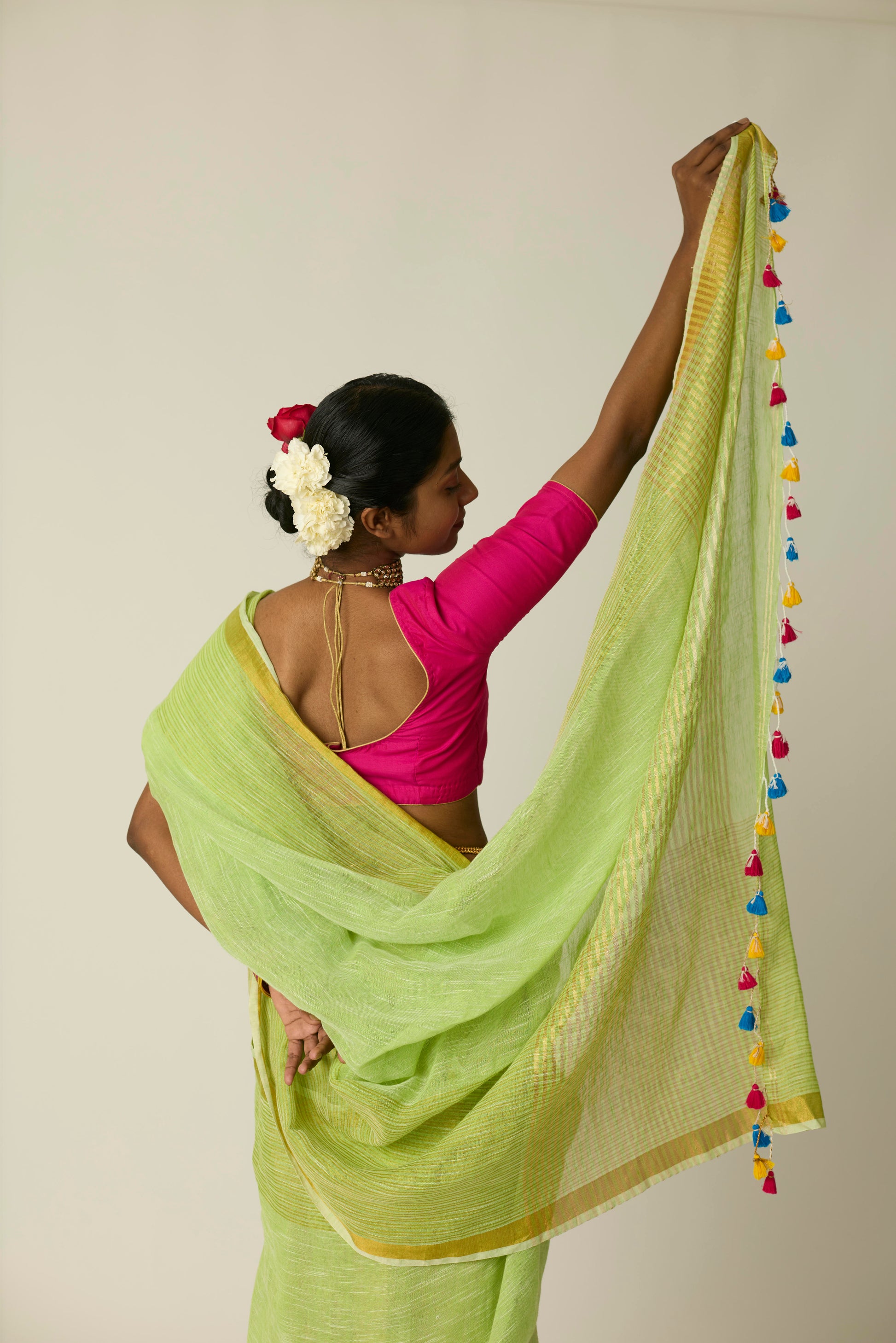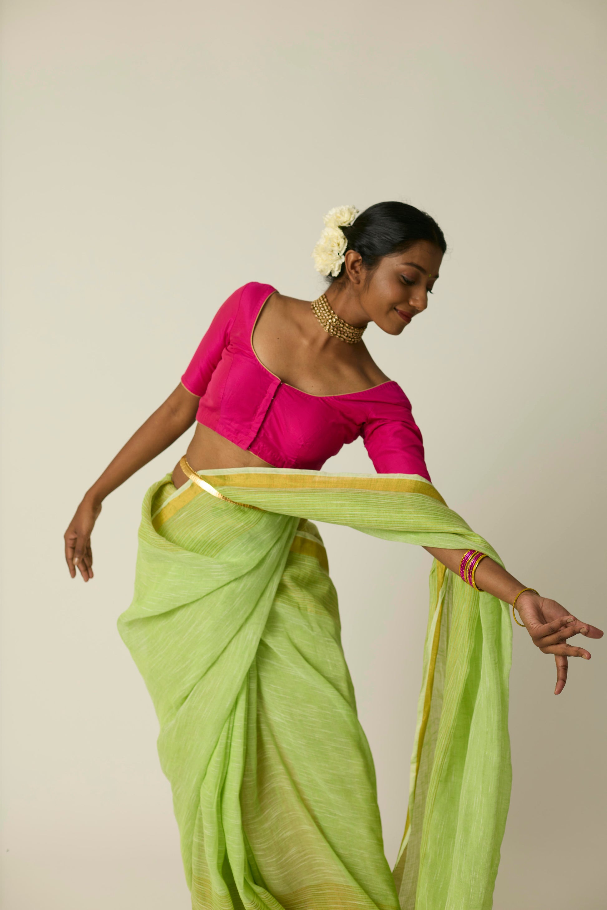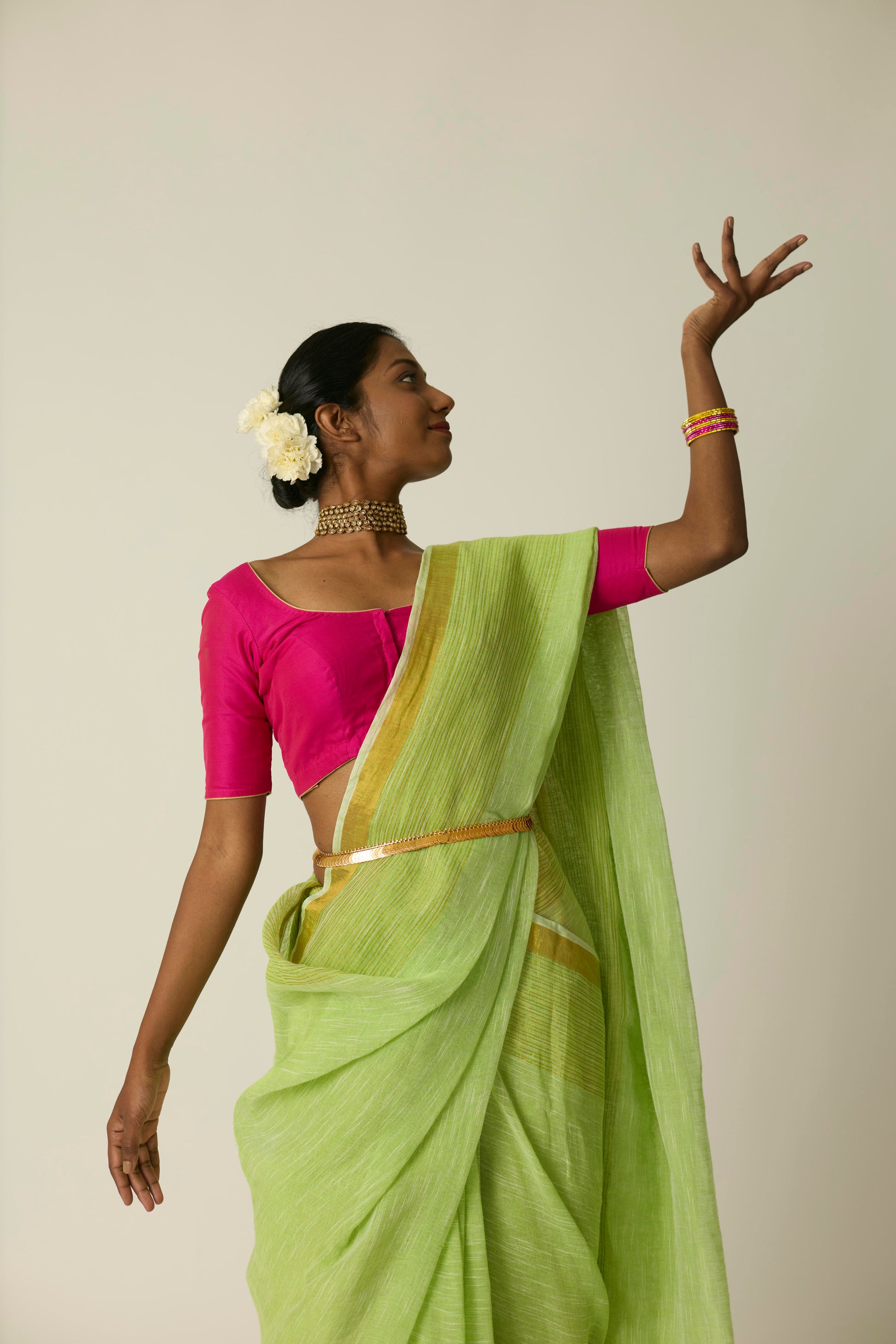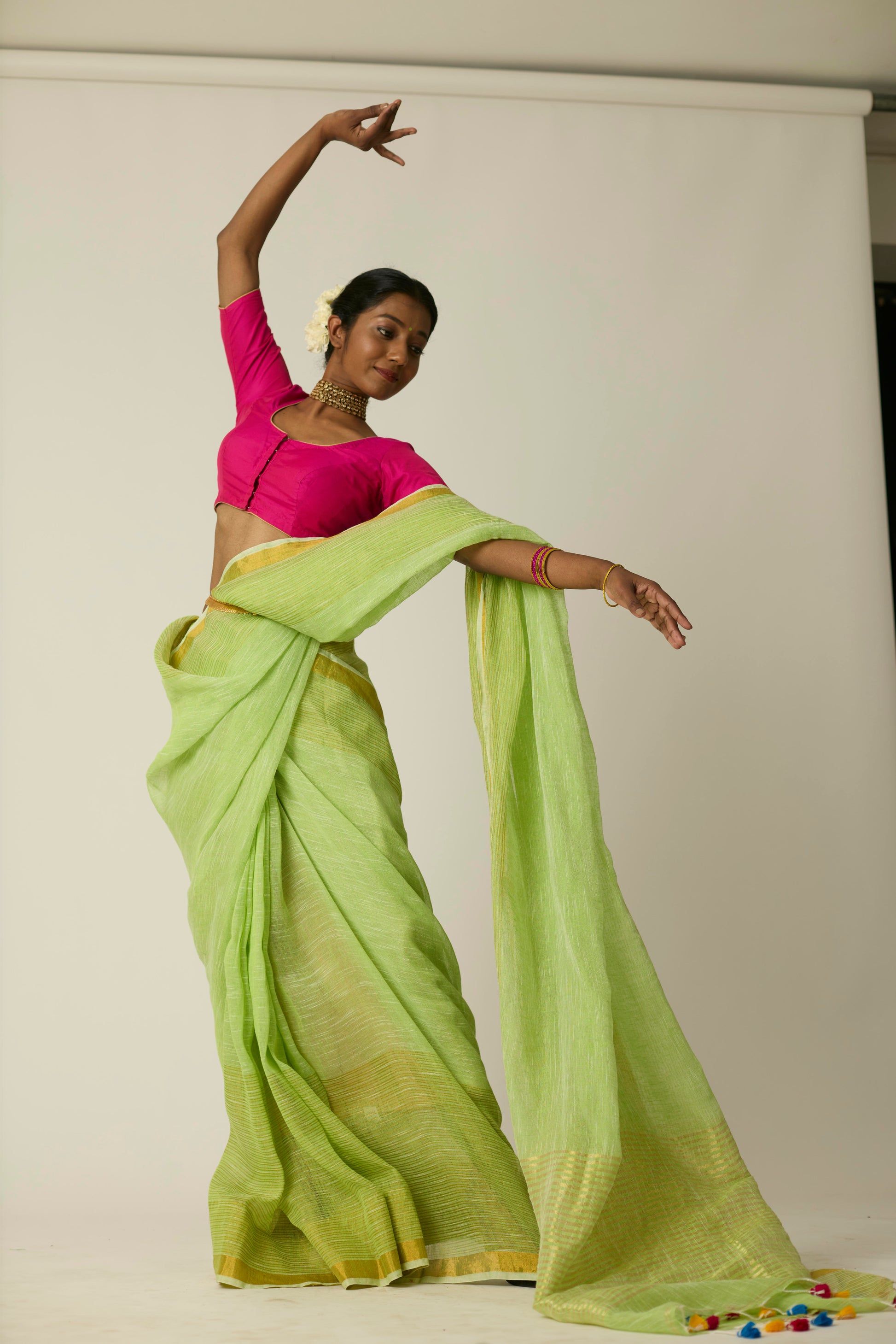 The Hari Sunheri saree is woven in breathable linen and bathed in a rich green hue. Its airy texture and natural drape deliver ease and sophistication in equal measure. Lightweight yet striking, this saree stands out effortlessly; whether it's a casual daytime gathering or an elegant evening event. Includes a matching blouse piece.