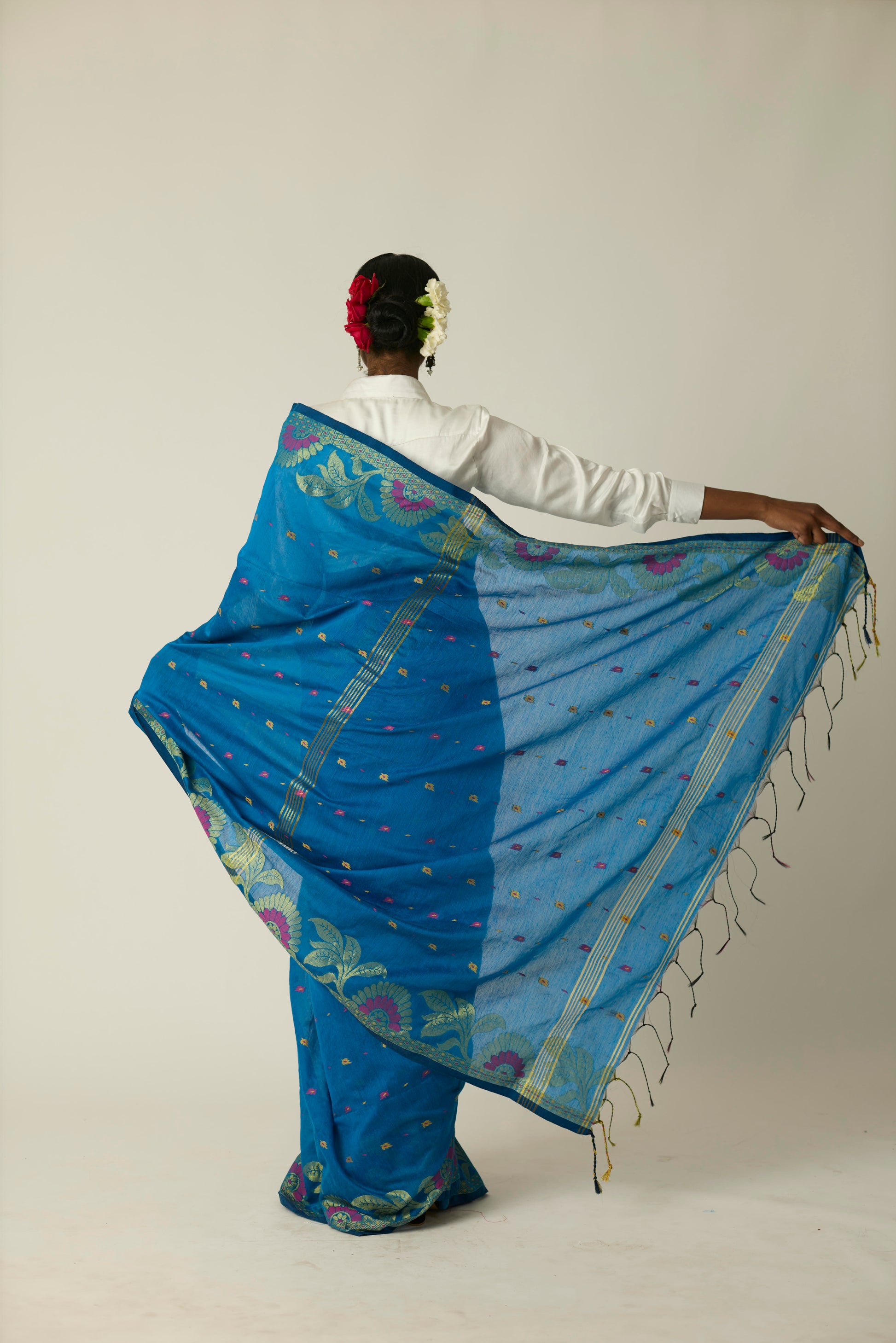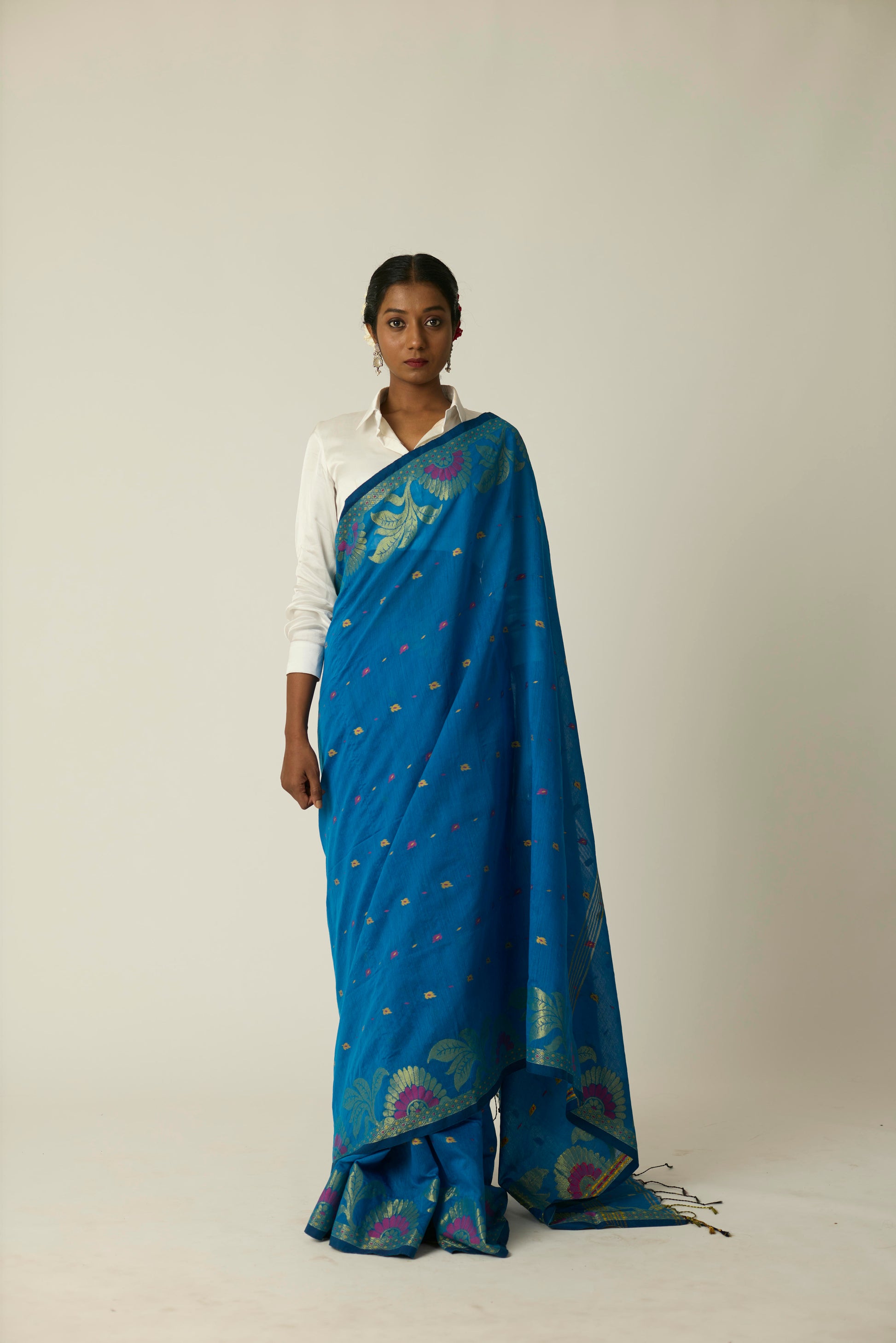 Shyama is spun from a cotton-silk blend, merging everyday comfort with a touch of polished brilliance. The soft aqua hue adds a sense of calm sophistication, while the fabric flows with ease and poise. Subtle yet striking, it’s perfect for warm days and graceful evenings alike. Includes a matching blouse piece.