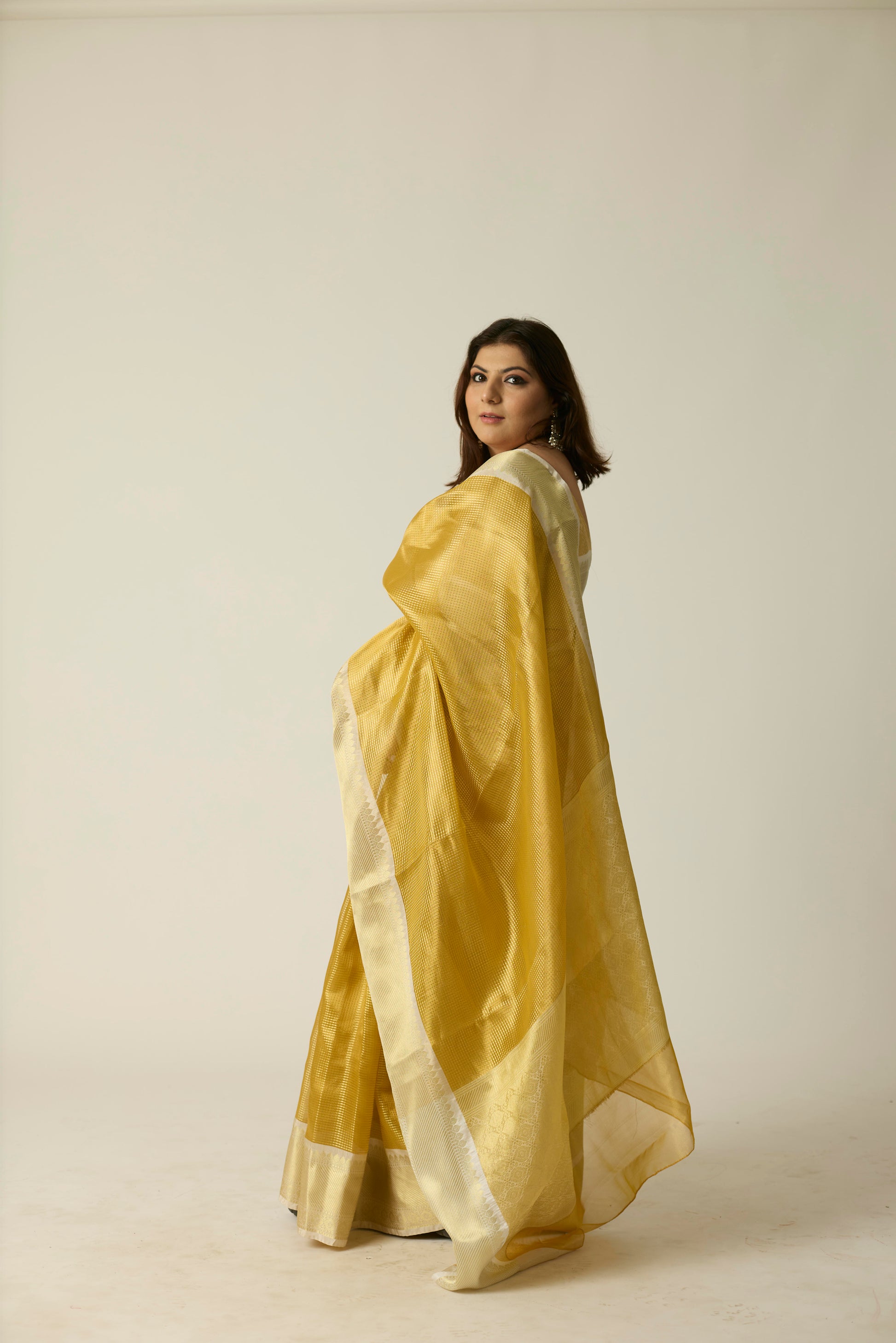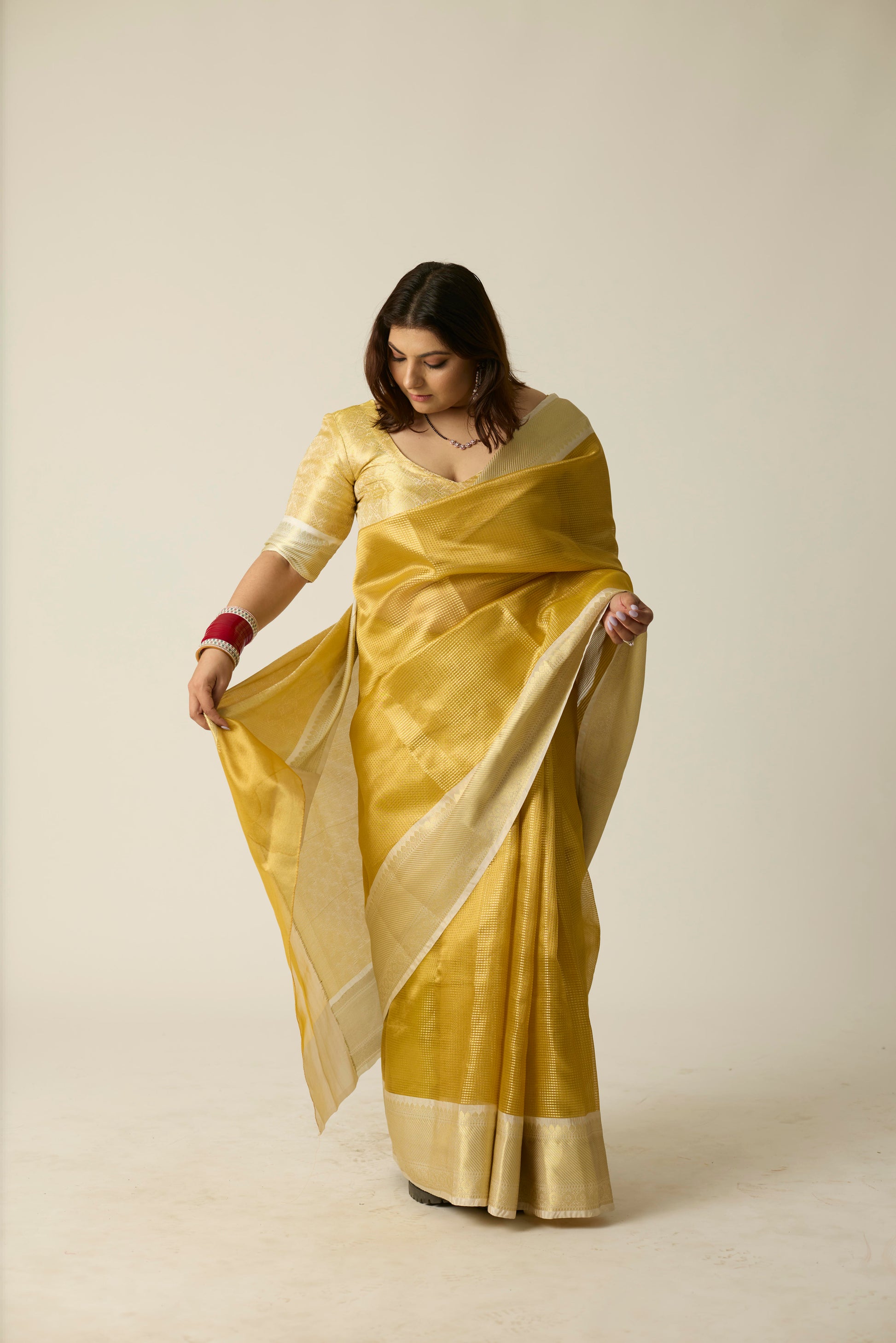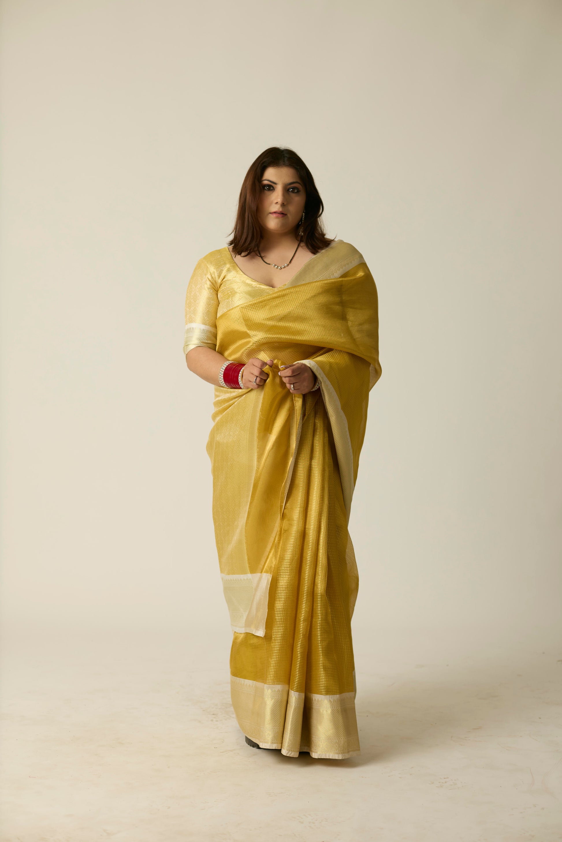 Woven in delicate tissue fabric, it offers a whisper-light silhouette with graceful shimmer that never goes unnoticed. Includes a matching blouse piece.