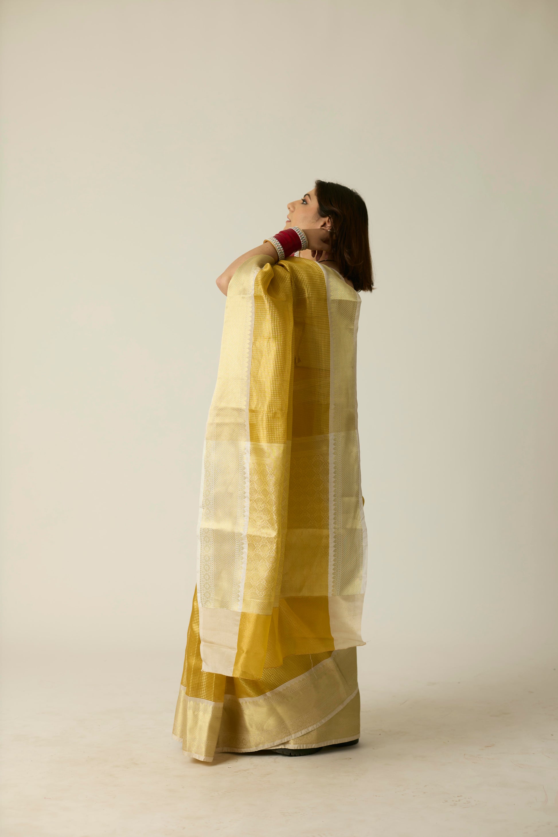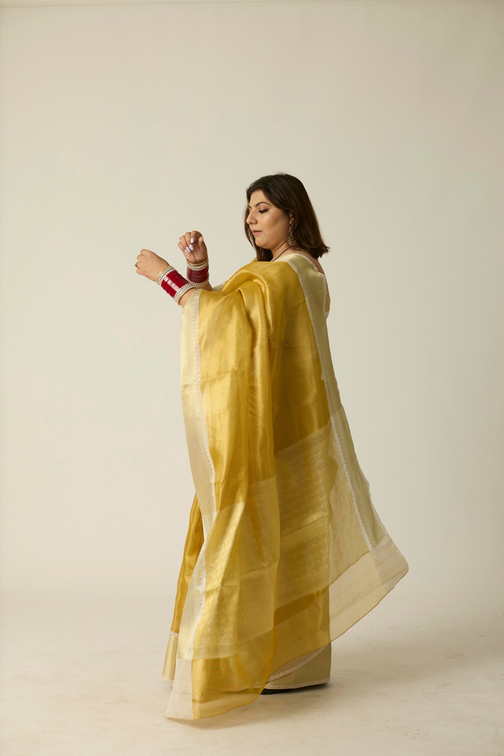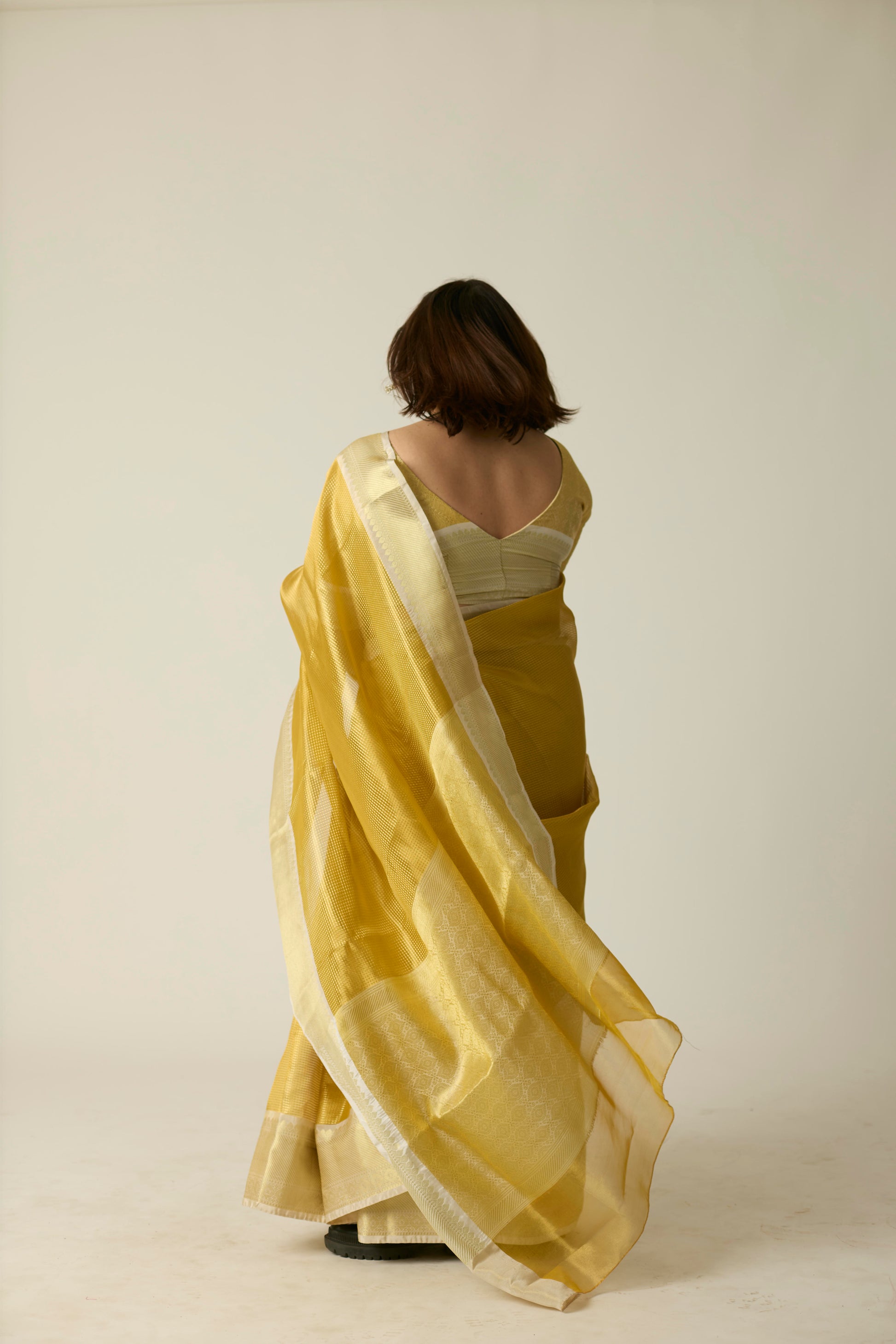 Woven in delicate tissue fabric, it offers a whisper-light silhouette with graceful shimmer that never goes unnoticed. Includes a matching blouse piece.